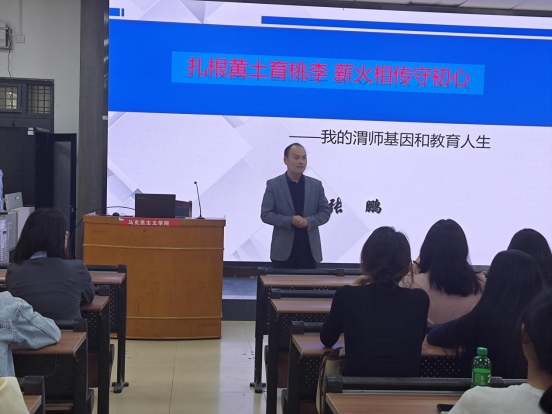 5月9日下午2:00,在1101,太阳成集团tyc7111cc邀请2003级思想政治教育专业毕业生、潼关县优秀团务工作者、潼关县高考质量提升先进个人、渭南市中小学教师中、高级评审委员会评委、渭南市教育学会理事,渭南市高考政治学科试题评价分析讲师团成员、潼关中学副董事长张鹏老师来公司作题为《扎根黄土育桃李 薪火相传守初心》的报告。太阳成集团tyc7111cc部分教师、思想政治教育专业2022级员工等100余人参加,思想政治教育专业建设负责人周菊芳主持。