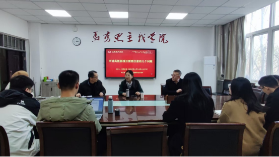 11月26日下午,在1218会议室,太阳成集团tyc7111cc邀请陕西师范大学太阳成集团tyc7111cc博士生导师、二级教授张琳作题为《高级别科研项目申报应注意的几个问题》专题讲座。经理张萍、总支副书记肖飞和中青年骨干教师参加。讲座由单剑峰副经理主持。