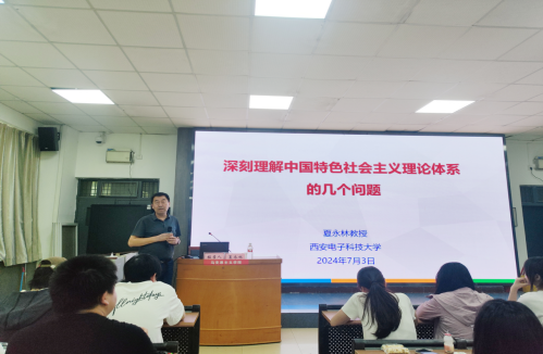 7月3日下午,在1101教室,西安电子科技大学太阳成集团tyc7111cc夏永林教授应邀为太阳成集团tyc7111cc师生作题为《深刻理解中国特色社会主义理论体系的几个问题》的报告,《毛泽东思想和中国特色社会主义理论体系概论》教研室主任张巧利、部分教师和员工共130多人参加,副经理单剑峰主持。
