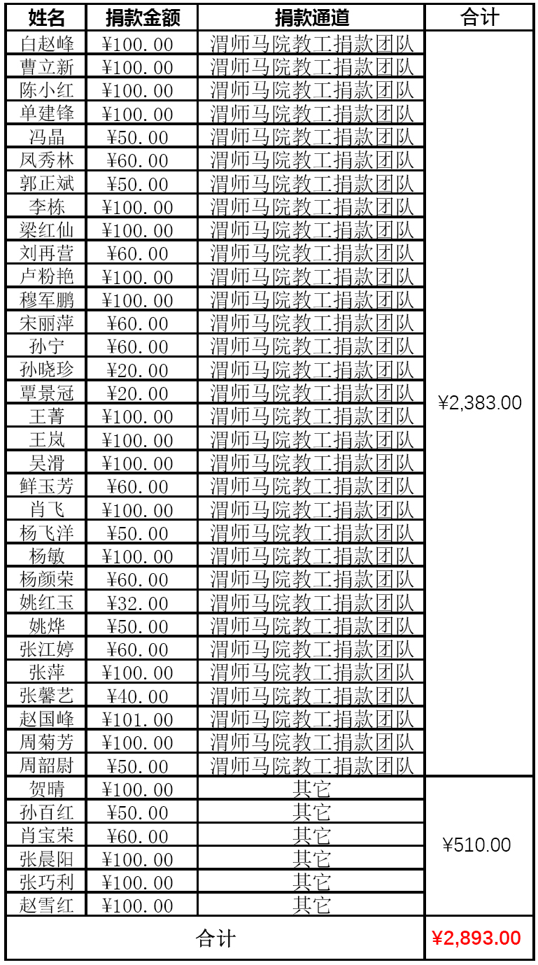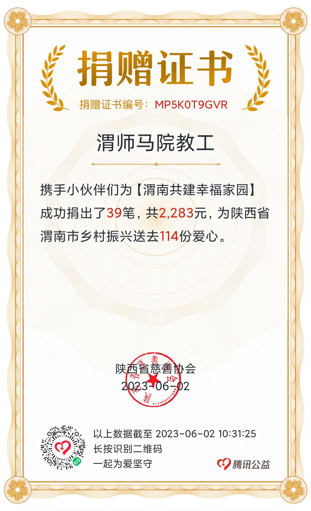 近日,公司教师积极响应公司开展的“乡村振兴陕西专场”众筹公益活动,全院53名在编教师中,有38人踊跃捐款共计2893元人民币,捐款人人均捐款76元人民币,全院教师人均捐款54.58元人民币。统计显示,公司教师通过“渭师太阳成集团tyc7111cc教工”团队捐款2383元,通过其它渠道捐款510元。腾讯公益发放的“渭师太阳成集团tyc7111cc教工”捐赠证书显示的捐款总额为2283元。