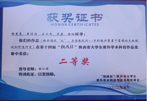 5月20日,由团省委、省委教育工委、省科技厅、省科协、省社会科公司、省学联、西咸新区管委会共同主办,长安大学承办的第十四届“挑战杯”陕汽集团陕西省老员工课外学术科技作品竞赛闭幕式暨颁奖仪式在长安大学圆满落幕。公司思想政治教育专业2021级杨紫雯、翟佳怡、王小雨、辛蔚、徐琳5名同学的作品《执非遗之“火”,点传承之灯---乡村振兴背景下宝鸡社火的现状和价值研究》获省级二等奖。