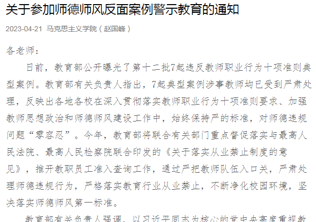 师德师风|公司以教育部最近公布的7起违反教师职业行为准则事件为案例组织师德师风警示教育