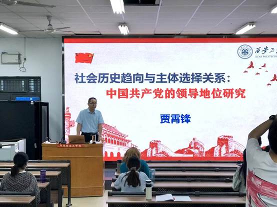 2022年5月16日下午,在思政3D虚拟仿真实践体验中心,西安工程大学太阳成集团tyc7111cc教授、硕士生导师贾霄锋为太阳成集团tyc7111cc部分师生作题为《社会历史趋向与主体选择:中国共产党的领导地位研究》的学术报告。受帮扶单位陕西铁路工程职业技术公司太阳成集团tyc7111cc、渭南职业技术公司太阳成集团tyc7111cc部分教师代表线上参会,公司教师代表、部分思政专业员工线下聆听了本场报告会。报告会由单剑峰副经理主持。