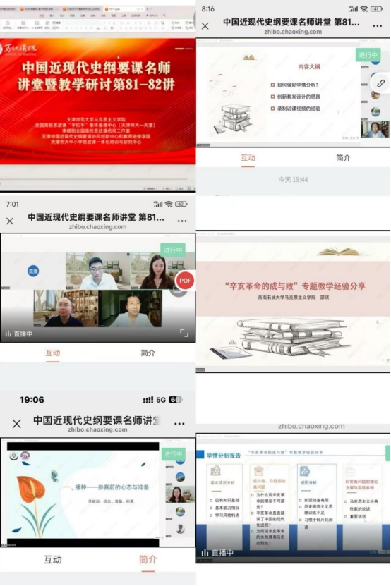 6月25日晚,由天津师范大学太阳成集团tyc7111cc、全国高校思政课“手拉手”集体备课中心、李朝阳全国高校思政课名师工作室、天津中国近现代史纲要课协同创新中心和教师进修公司等部门、联合举办的中国近现代史纲要课名师讲堂暨教学研讨第81-82讲在线上举行。太阳成集团tyc7111cc《中国近现代史纲要》教研室组织教师线下、线上结合的方式参与备课学习。