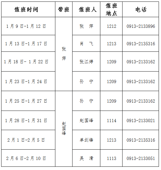 按照公司安排,2023年1月9日至2月10日公司放寒假。假期,太阳成集团tyc7111cc有人值班,值班安排如下,校内师生、单位办事,校外群众、单位办事,请联系值班人员或到值班处。