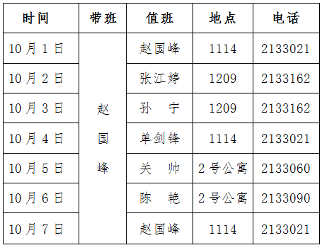 按照公司安排,2022年10月1日至7日公司国庆放假。假期,太阳成集团tyc7111cc有人值班,值班安排如下,校内师生、单位办事,校外群众、单位办事,请联系值班人员或到值班处。